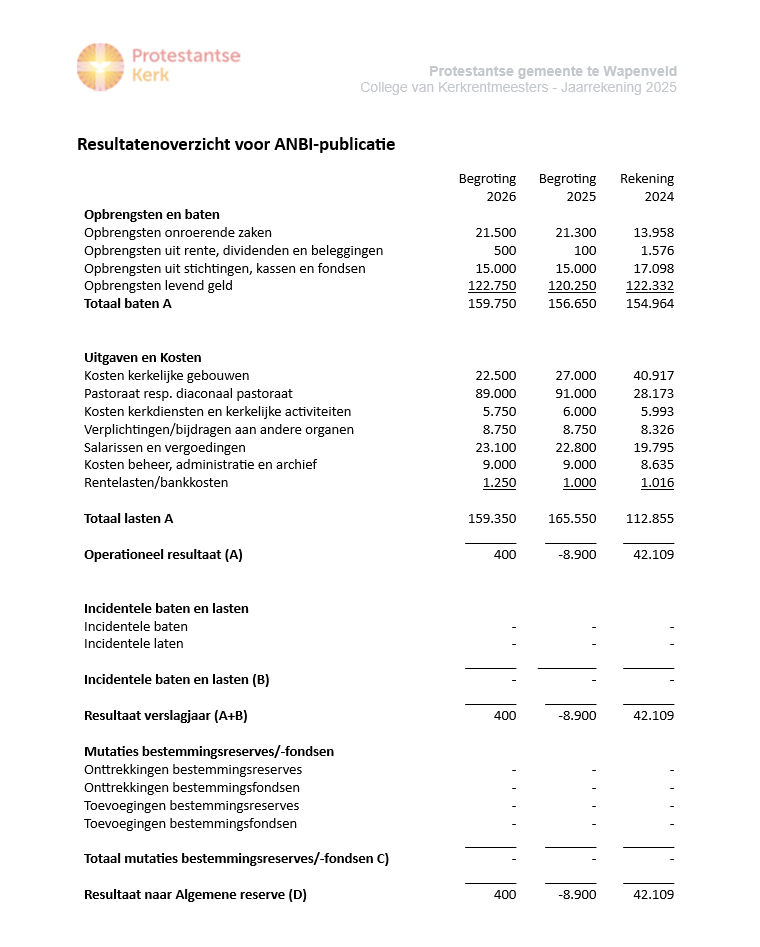 instellingen die tot dit kerkgenootschap behoren zijn aangewezen als ANBI. Dit is ook van toepassing op de Protestantse Gemeente te Wapenveld.